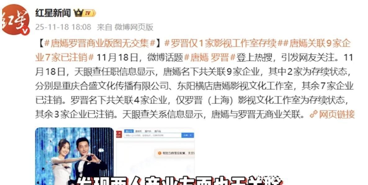 他们俩差不多快半年都没一起出现,也几乎没有互动在社交平台上。有些人觉得,这完全看不出是正常夫妻的模样。有人还注意到,唐嫣名下家企业,现在只剩𰱰家还在正常运营。罗晋手里头家企业,现如今只剩下一家处于存续状态。两个人之间没有任何共同挂钩的企业,这事儿真让人觉得不少疑点。